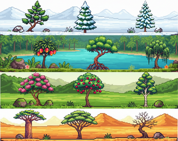 Each tree is provided in three resolutions to fit different camera zoom levels and art directions, making this pack flexible for both small-scale and HD pixel art projects.