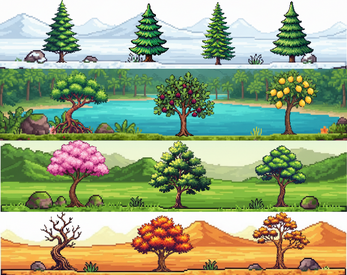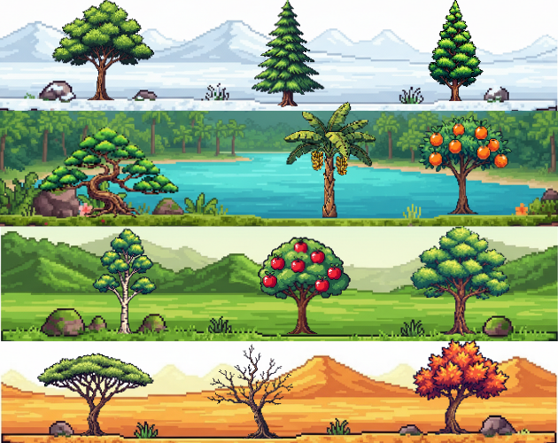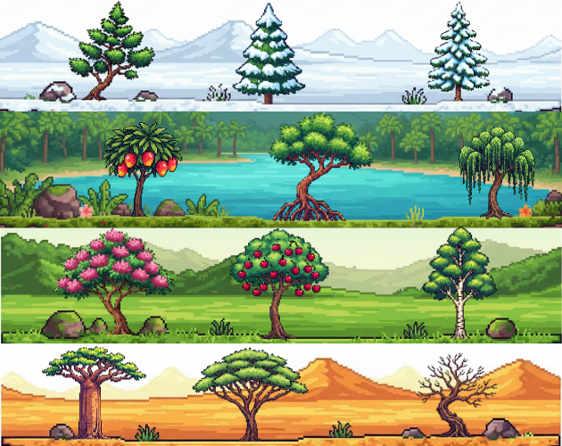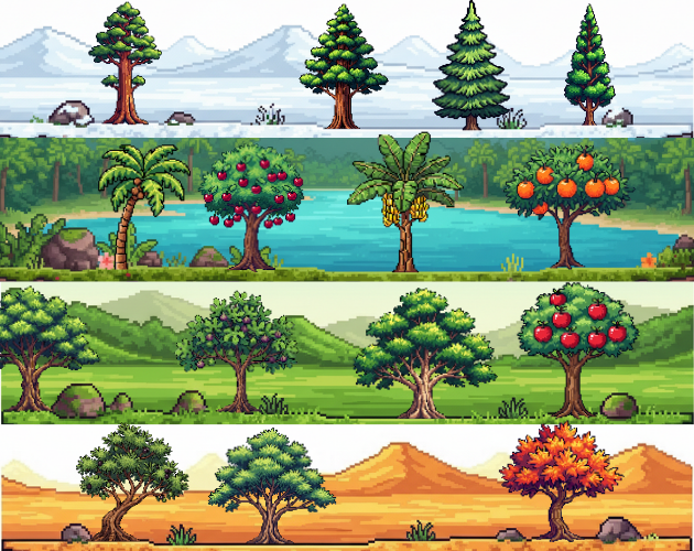 A high-quality pixel art tree asset pack featuring 55 unique tree designs, carefully crafted for 2D games, RPGs, farming sims, city builders, and strategy games.